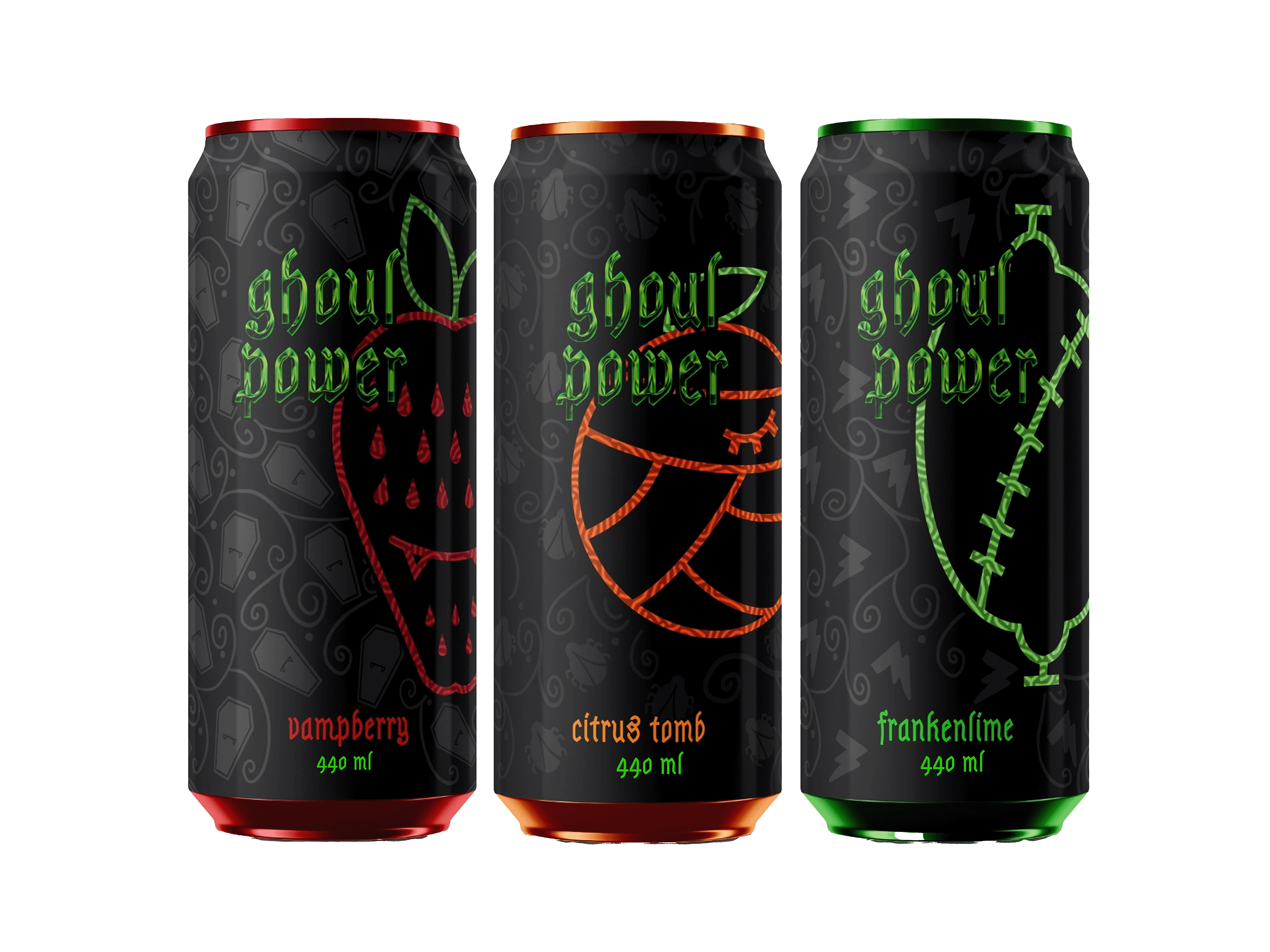 This project imagines the creation of a line of energy drinks entitled, "Ghoul Power". The driving design inspiration comes from famous monsters including Dracula, The Mummy, and Frankenstein. Each flavor has a different name to reflect which monster they represent.